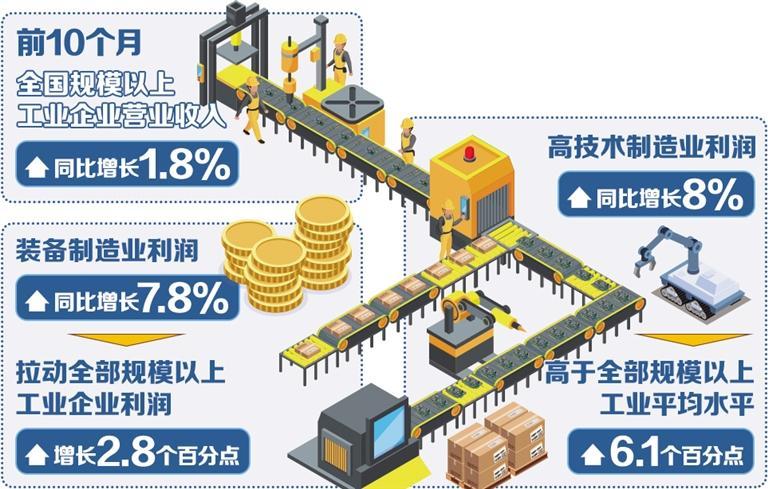 今年以来,各地区各部门认真落实党中央、国务院决策部署,着力做强国内大循环,积极畅通国内国际双循环,带动工业企业利润稳定增长,工业经济高质量发展稳步推进。国家统计局数据显示,前10个月,全国规模以上工业企业营业收入同比增长1.8%,为工业企业盈利恢复创造了有利条件;规模以上工业企业利润同比增长1.9%,自今年8月份以来累计增速连续3个月保持增长。