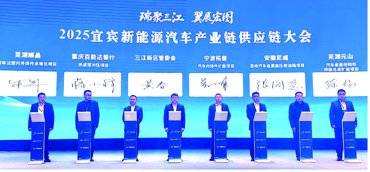 12月4日,以“瑞聚三江 翼展宏图”为主题的2025宜宾新能源汽车产业链供应链大会在宜宾成功举办。本次供应链大会共签约项目7个,包括拓普集团、重庆百能达普什、安徽尼威等企业,涵盖汽车内饰、热成型件、燃油箱等多个领域。