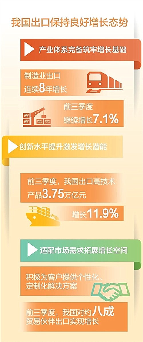 创新水平提升激发增长潜能。前三季度,我国出口高技术产品3.75万亿元,增长11.9%,对同期整体出口增长贡献率超三成。
